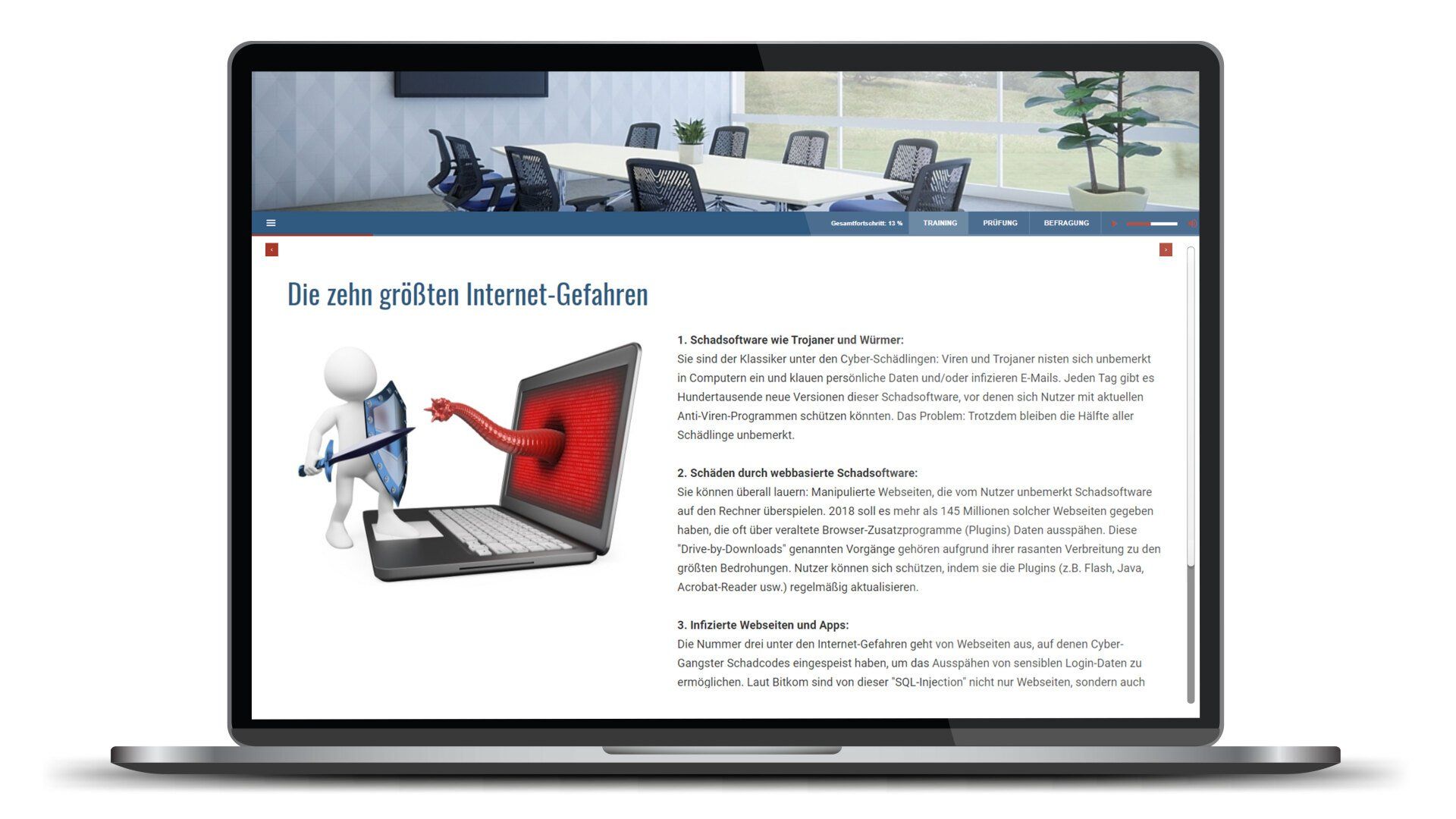 Prinzipiell sind alle unsere E-Learning-Trainings auf die individuellen Bedürfnisse unserer Kunden flexibel anpassbar. Sie können die Trainingsinhalte frei miteinander kombinieren, unternehmensspezifische Themen/Inhalte hinzufügen, Dokumente zum Download integrieren u. v. m.